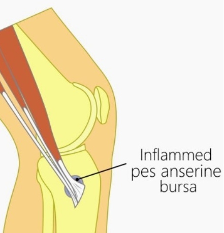 거위발건과 무릎의 점안액에 반복적으로 마찰이 일어나게 되면 염증이 발생할 수 있습니다.